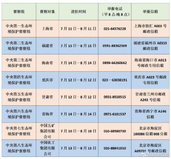 進(jìn)駐期間,各督察組將分別設(shè)立聯(lián)系電話和郵政信箱,受理被督察對象生態(tài)環(huán)境保護(hù)方面的來信來電舉報。具體舉報方式如下表: